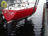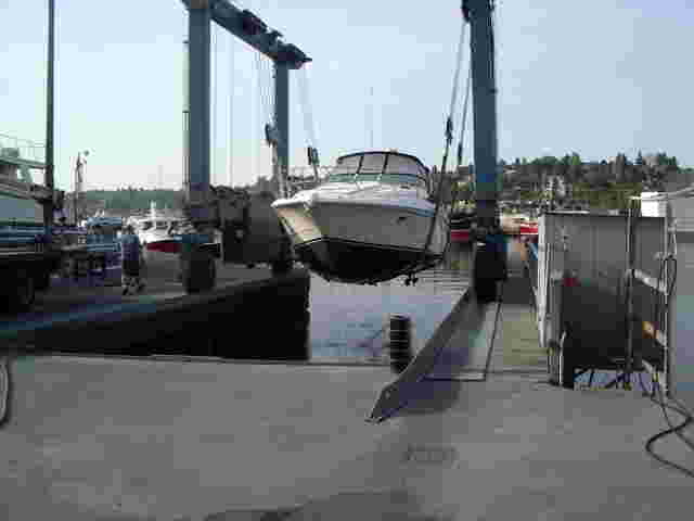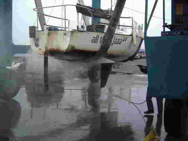 Boat Yard. Lots of algae on the bottom. Difficult to see boot stripe. Professional pressure washing